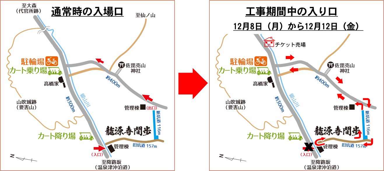龍源寺間歩、入り口付近の舗装工事を令和7年12月8日(月)から12月12日(金)に実施します。