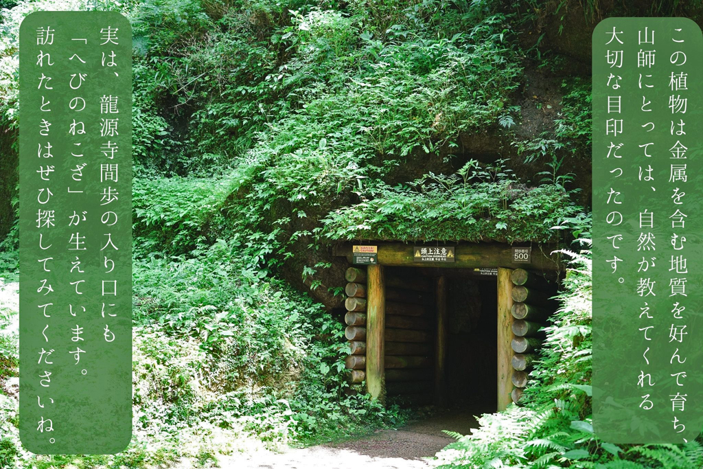 坑道は一部しか公開されていませんが、鉱脈に沿って掘り進んだ横穴や垂直に掘られた竪坑を見ることができます。また、周辺に見られる「ヘビノネゴザ」というシダ植物は、貴金属を含む土壌でも育つ性質を持ち、金や銀の鉱山発見の手がかりになったと言われています。