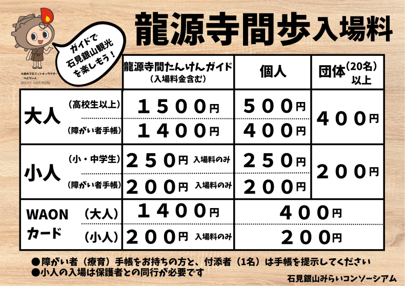 - 龍源寺間歩では、次の入場者に限り入場料を減免(免除)しています。